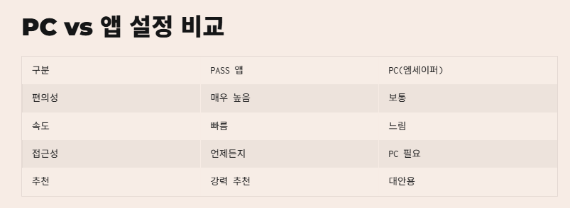 PC에서도 가능하지만, PASS 앱이 훨씬 간편하고 빠르게 설정할 수 있어요.