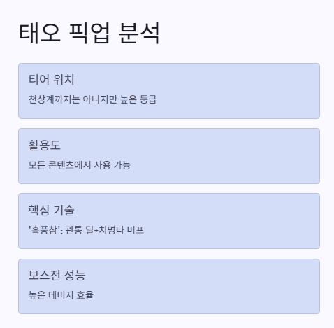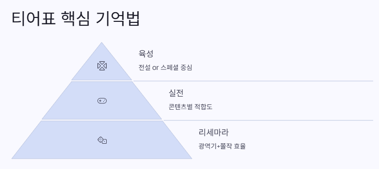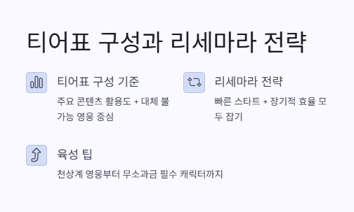 주요 콘텐츠 활용도와 대체 불가능한 영웅 중심으로 구성된 티어표입니다. 리세마라와 실전 플레이 모두 고려하여 만든 점이 특징입니다.