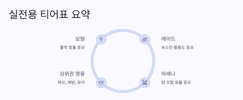 실전용 티어표는 모험, 레이드, 아레나 등 콘텐츠에 따라 달라져요. 무조건 쫄작만 보는 게 아니라, 팀 조합 효율이나 보스전 활용도도 중요한데요, 요즘은 태오랑 에반, 유이도 티어 상위권으로 평가되더라고요. 특히 태오는 관통딜+부활이라 진짜 쩔어요.