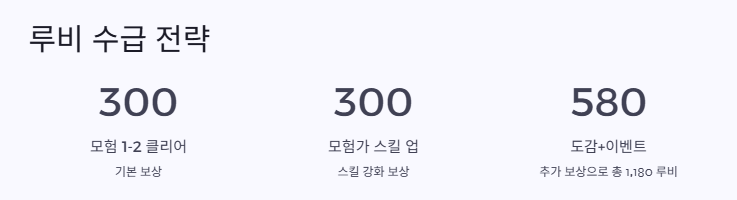 → 게임 내 도감, 모험 보상, 이벤트 보상으로 약 1,180 루비 획득 가능