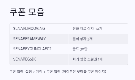 👉 쿠폰 입력: 설정 > 계정 > 쿠폰 입력 (아이폰은 넷마블 쿠폰 페이지)