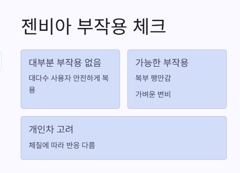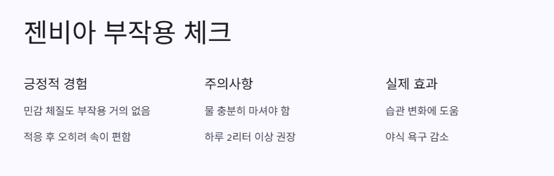 가장 궁금한 부분이 이거지! 나도 솔직히 민감 체질이라 무슨 보조제만 먹으면 배 아프고, 속 더부룩하고 그랬는데… 놀랍게도 젠비아는 그런 부작용이 거의 없었어. 물론 사람마다 다르겠지만, 나 같은 경우는 복용 3일차까지는 그냥 미묘한 가벼움? 이후엔 적응돼서 오히려 속이 더 편하더라고.