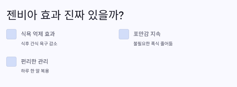 블로그나 카페에서 젠비아 내돈내산 후기를 보면 식욕 억제에 만족하는 사람들이 많고, 부작용은 거의 없었다는 평이야.