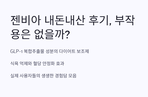 젠비아 내돈내산 후기에 대한 생생한 사용 경험을 바탕으로 실제 효과와 부작용 여부를 꼼꼼히 정리했습니다. GLP-1 복합추출물 성분이 포함된 다이어트 보조제로 알려진 젠비아는 식욕 억제와 혈당 안정화에 도움을 준다고 알려져 있어요. 직접 복용해본 사람들의 진짜 후기를 통해 부작용 없는 다이어트 보조제를 찾고 있는 분들에게 실질적인 정보를 제공해드립니다.