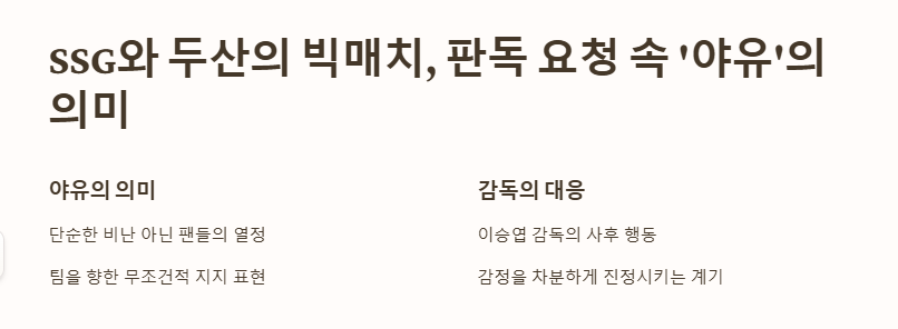 두산의 비디오 판독 요청 당시 인천 SSG랜더스필드는 SSG 팬들의 야유로 가득 찼다. 이 야유는 단순한 비난이 아니라 홈팬들의 열정과 팀을 향한 무조건적인 지지의 표현이었다. 하지만 이승엽 감독이 보여준 사후 행동은 그런 감정을 차분하게 진정시켜주는 계기가 되었다.