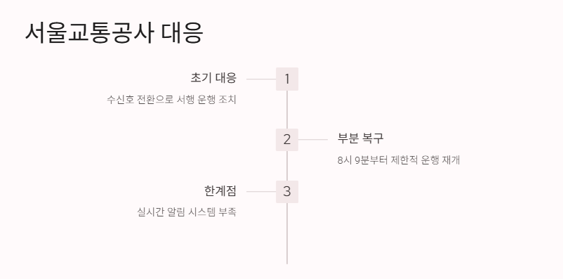 서울교통공사는 수신호로 대체 운행했지만, 실시간 알림 부족과 환승 지연으로 시민들의 불만은 극에 달했습니다.
