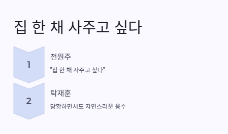 “집 한 채 사준다니, 나중에….” 이런 솔직한 리액션은 진짜 리얼 예능이구나 싶더라구요.