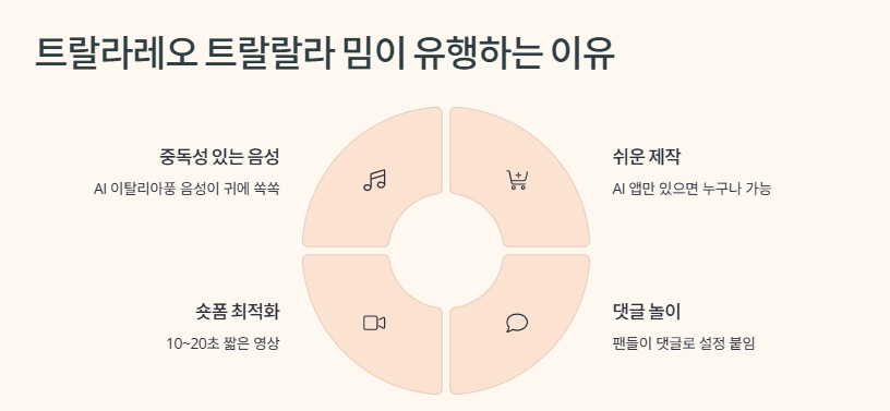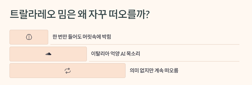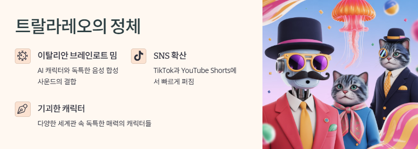 ‘트랄라레오 트랄랄라’를 한 번만 들어도 머릿속에 박혀요. 이탈리아 억양을 흉내 낸 AI 목소리로 반복되는 멘트가 진짜 뇌에 박히는 느낌… 진짜 아무 의미도 없는데 이상하게 계속 떠오름.