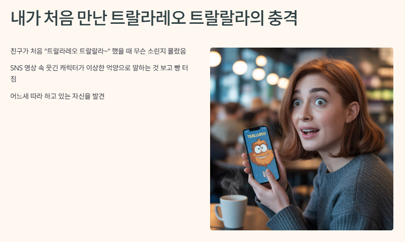 진짜 처음엔 친구가 “트랄라레오 트랄랄라~” 하길래 무슨 소린가 했거든요? 근데 SNS 영상 속에서 진짜 너무 웃긴 캐릭터가 이상한 억양으로 “트랄라레오 트랄랄라” 하면서 춤추는 거 보자마자 빵 터졌어요. 멍하니 보다가, 어느새 저도 따라 하고 있더라구요… 이게 바로 ‘트랄라레오 트랄랄라’ 밈의 무서운 중독성!