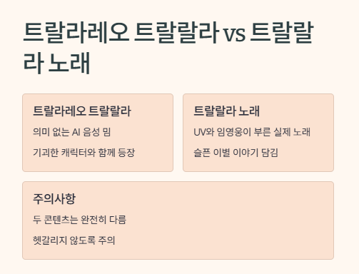 그건 슬픈 이별 이야기인데 ‘트랄라레오 트랄랄라’ 밈이랑은 완전 달라요. 헷갈리지 않게 주의해야 해요!