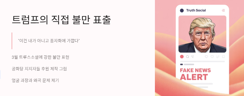 트럼프 초상화에 대한 논란은 지난 3월에 처음 터졌어요. 트럼프가 직접 SNS에 “이건 내가 아니고 풍자화에 가깝다”며 강하게 불만을 표출했거든요. 진짜 트루스소셜에 글 올렸던 거 봤는데, 너무 강하게 말해서 진짜 놀랐어요.