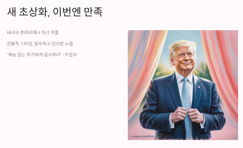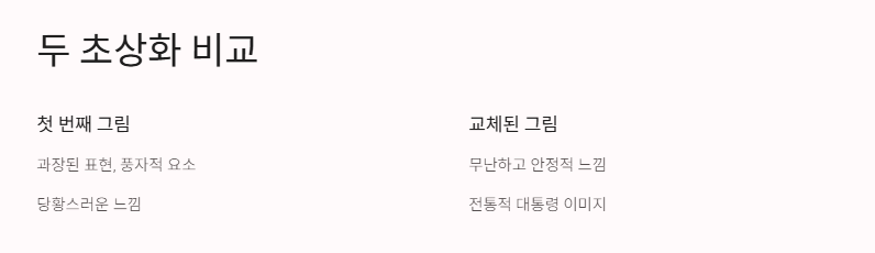 솔직히, 첫 그림 보고 저도 살짝 당황했어요ㅋㅋ 사진은 아니고 그림이라 과장될 수는 있지만, 대통령 얼굴이 그렇게 묘사되니까 “이거 진짜 괜찮은 거야?” 싶었거든요. 나중에 바뀐 그림은 딱 무난하고 안정적인 느낌. 트럼프 이미지에선 이게 더 잘 어울리는 것 같긴 했어요.