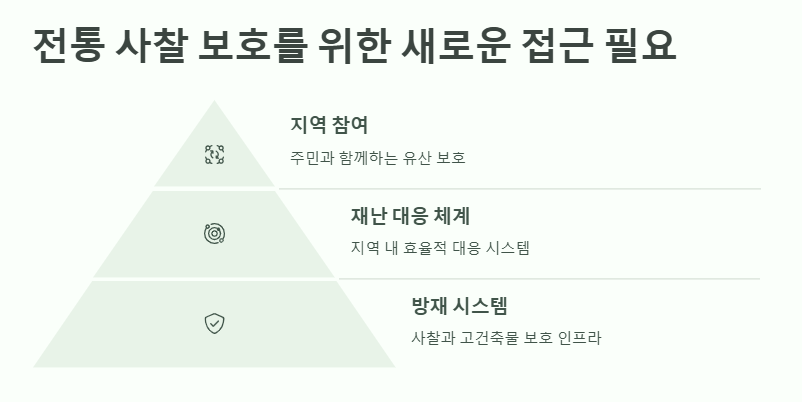 문화재 방재 시스템 도입, 지역 사회의 관심과 참여, 정기적인 점검 및 교육 강화가 필요한 상황입니다.