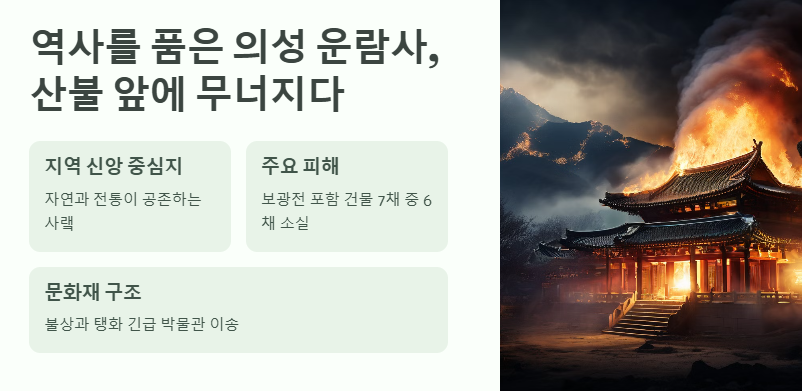 경상북도 의성군에 위치한 운람사는 신라 시대 의상대사가 창건한 것으로 전해지는 유서 깊은 사찰입니다. 그러나 지난 3월, 예상치 못한 산불로 인해 이 고요한 사찰이 큰 피해를 입었습니다. 이번 의성 운람사 화재는 단순한 자연재해를 넘어서, 우리 문화유산의 소중함을 다시금 일깨우는 계기가 되었습니다.