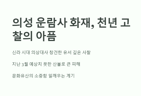이번 화재는 단순히 사찰 하나의 소실을 의미하는 것이 아닙니다. 자연과 문화유산이 함께 소실되면서 지역 사회 전체가 상처를 입었습니다. 운람사는 의성의 상징적인 존재였기에, 그 피해는 지역의 정체성에도 큰 영향을 주고 있습니다.