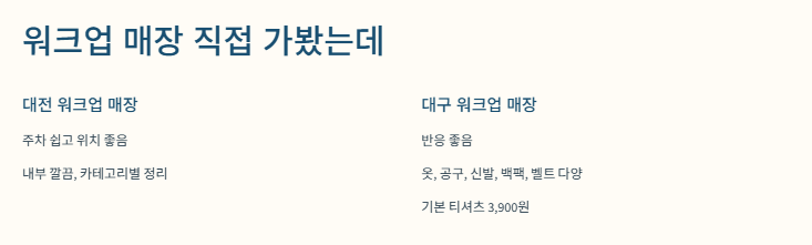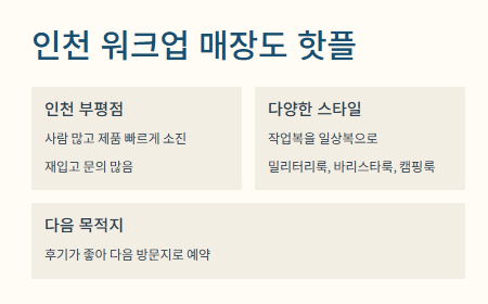 저는 다음번엔 ‘인천 워크업 매장’ 가보려고요. 후기가 진짜 난리더라고요. 특히 인천 부평점은 사람 진짜 많고 제품이 빠르게 빠져서 ‘재입고 언제 되냐’는 질문도 많대요. 요즘은 작업복도 일상복으로 입는 분위기잖아요. 거기에 밀리터리룩, 바리스타룩, 심지어 캠핑룩까지 구비돼 있어서 다양하게 즐길 수 있어요.