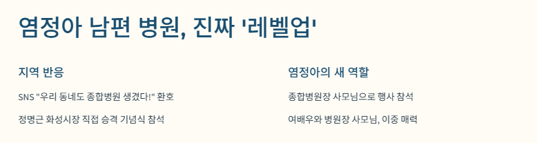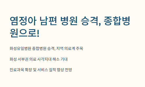 염정아 남편 병원 승격 소식은 지역 커뮤니티에도 엄청 퍼졌더라고요. SNS 보면 “드디어 우리 동네도 종합병원 생겼다!”는 댓글도 많고요. 정명근 화성시장님도 직접 승격 기념식에 참석해서 축하 메시지를 전했대요.