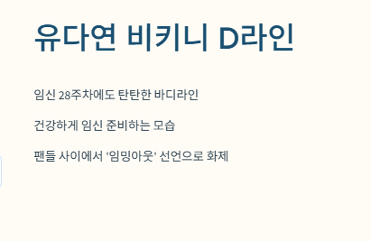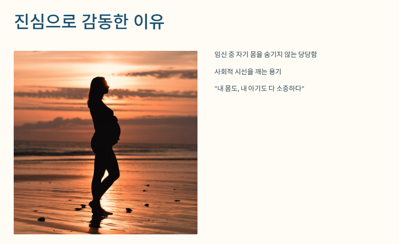 임신 중에 자기 몸을 숨기지 않고, 비키니를 당당하게 입고 나온 유다연을 보면서 저도 진짜 많은 생각이 들었어요. 사회적으로는 여전히 임산부의 몸매에 대해 조심스러운 시선이 있잖아요. 근데 그런 시선을 깨고 유다연은 “내 몸도, 내 아기도 다 소중하다”는 메시지를 너무 예쁘게 보여줬어요. 이게 진짜 멋진 엄마의 모습 아닌가요?