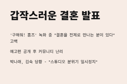 윤정수 결혼 소식은 진짜 예상 못 했어. '구해줘! 홈즈' 방송 녹화 도중에 "결혼을 전제로 만나는 분이 있다"고 고백했다는데, 예고편에 그 장면이 나오자마자 커뮤니티 다 난리 났어. 윤정수 근황이 뜸하다 싶었는데 이렇게 큰 소식을 들고 올 줄은 몰랐지. 나도 윤정수 라디오도 가끔 들었는데 거기선 이런 얘기 한 적 없었던 거 같아서 더 놀랐어.