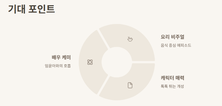 나는 솔직히 임윤아 님이랑 어떤 케미 보여줄지가 제일 궁금해! 둘이 각자 톡톡 튀는 매력 있어서 장면 하나하나 보는 재미가 있을 것 같더라구. 게다가 요리 중심 에피소드가 많을 것 같은데, 음식 비주얼까지 기대 중!